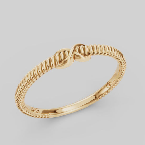 Inspirado en el símbolo del infinito, este anillo de oro destaca por su banda con textura estilo cuerda y su brillo sutil. Una pieza minimalista con un toque de profundidad y emoción.