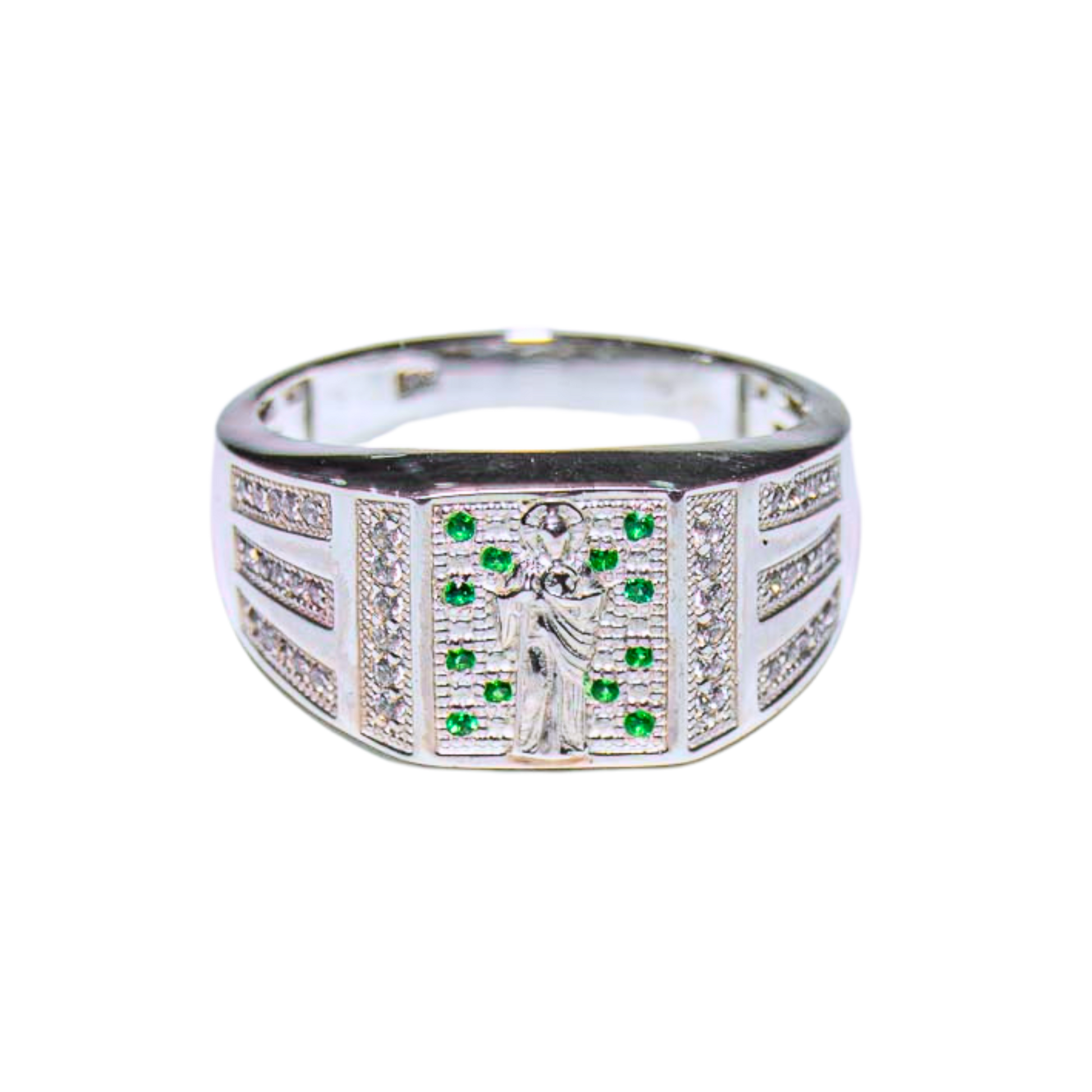 Featuring beautiful emeralds and 0.13ct in diamonds, this ring is a men's jewelry piece with a solid, symbolic and decorative design that makes it both a style statement and an object of spiritual value.
