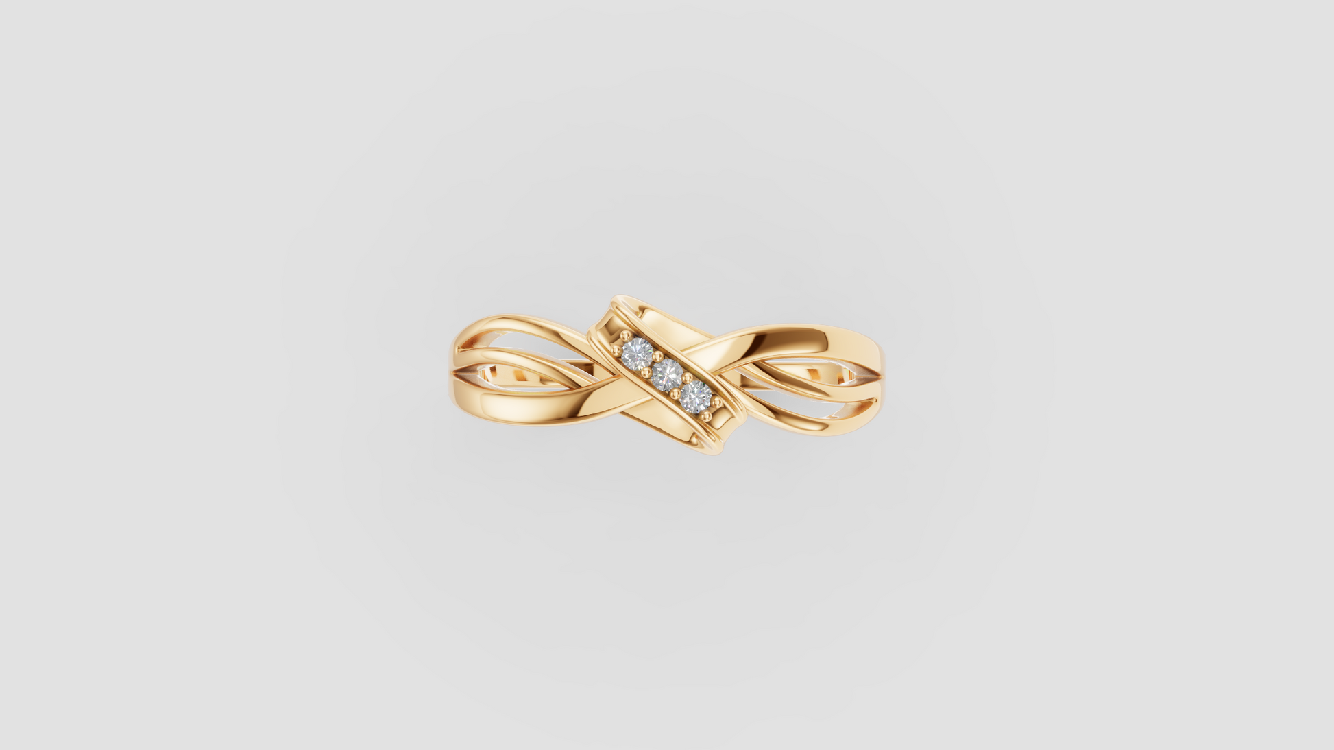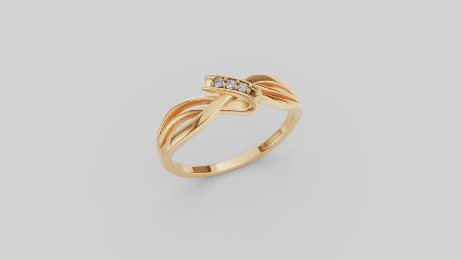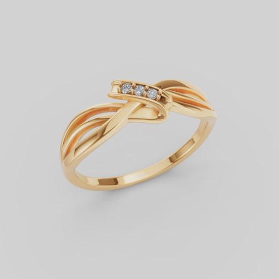 El diseño cruzado simula un abrazo estilizado donde la banda del anillo se divide y se envuelve sobre sí misma mientras tres diamantes se encuentran en el centro, generando armonía visual y dándole un carácter elegante y atemporal.