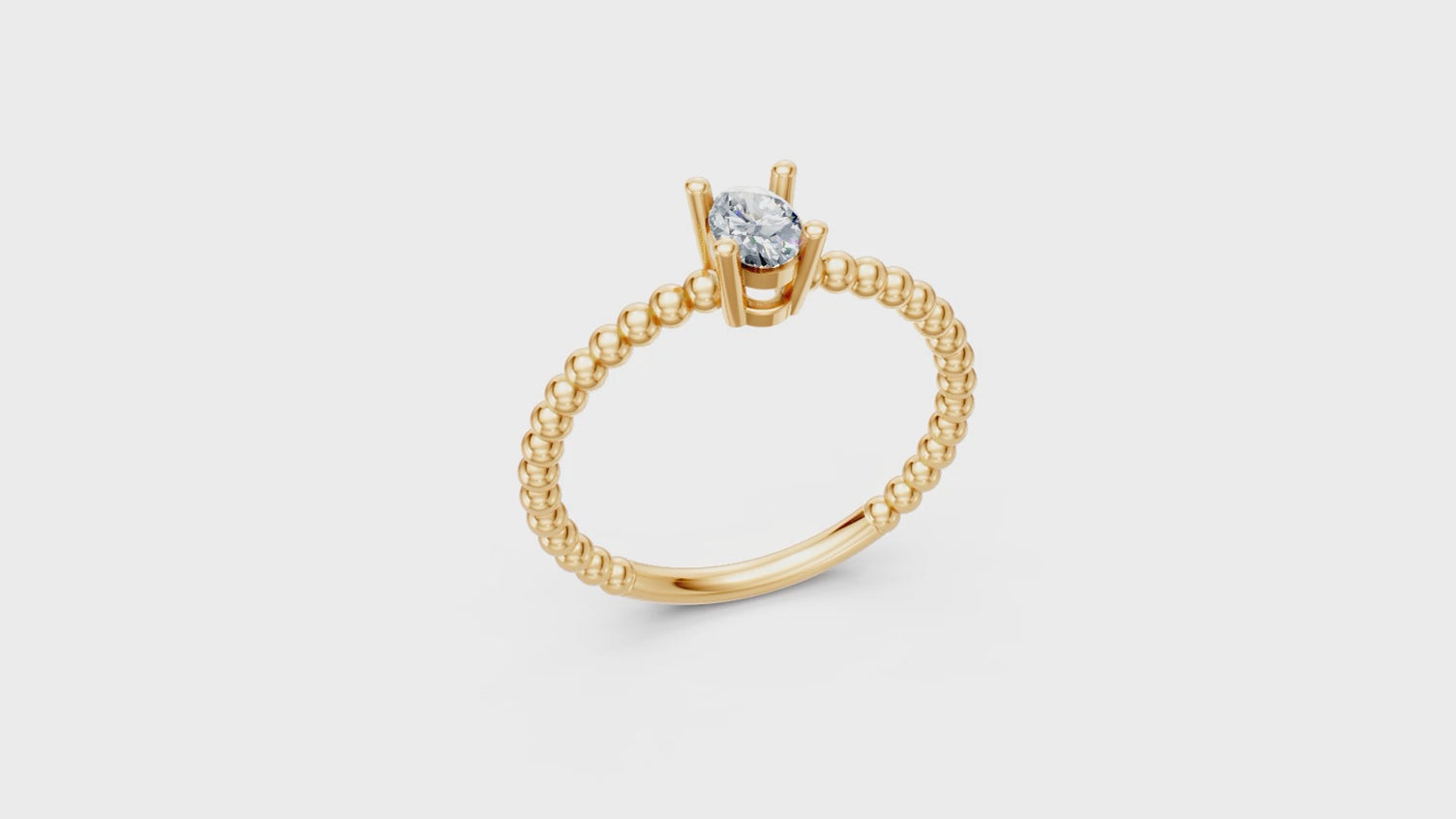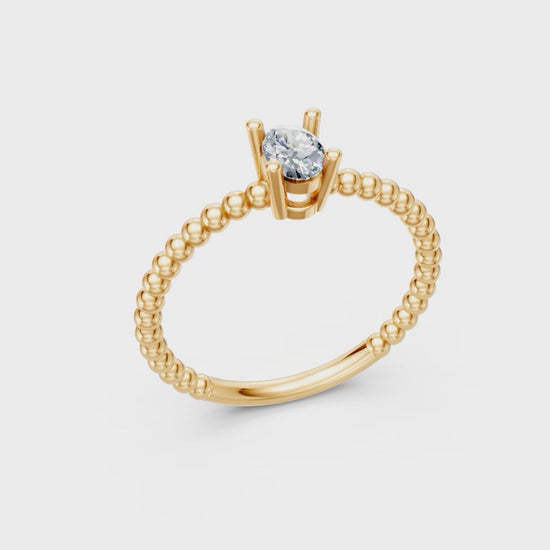 Este anillo combina la suavidad del oro con el resplandor de una piedra ovalada. Su banda de cuentas crea un efecto único, perfecto para quienes buscan una joya fina y diferente.