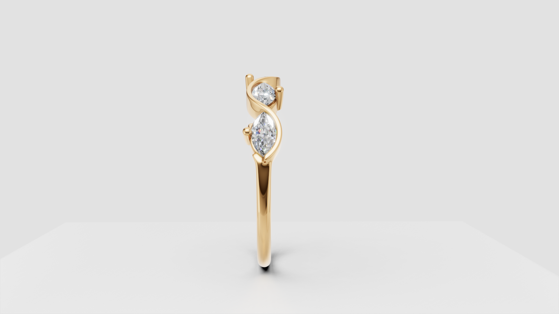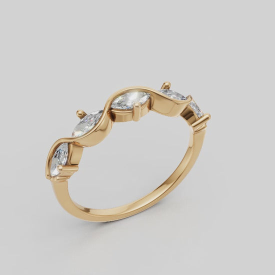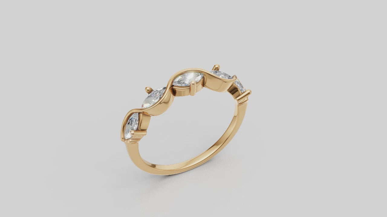 Un anillo que parece hacerle homenaje a los cuellos populares del renacimiento europeo. Una banda de oro risada se envuelve al rededor de brillantes diamantes de corte marquese.