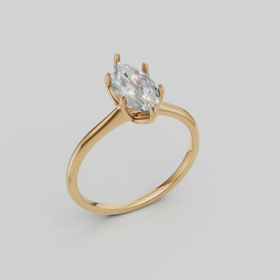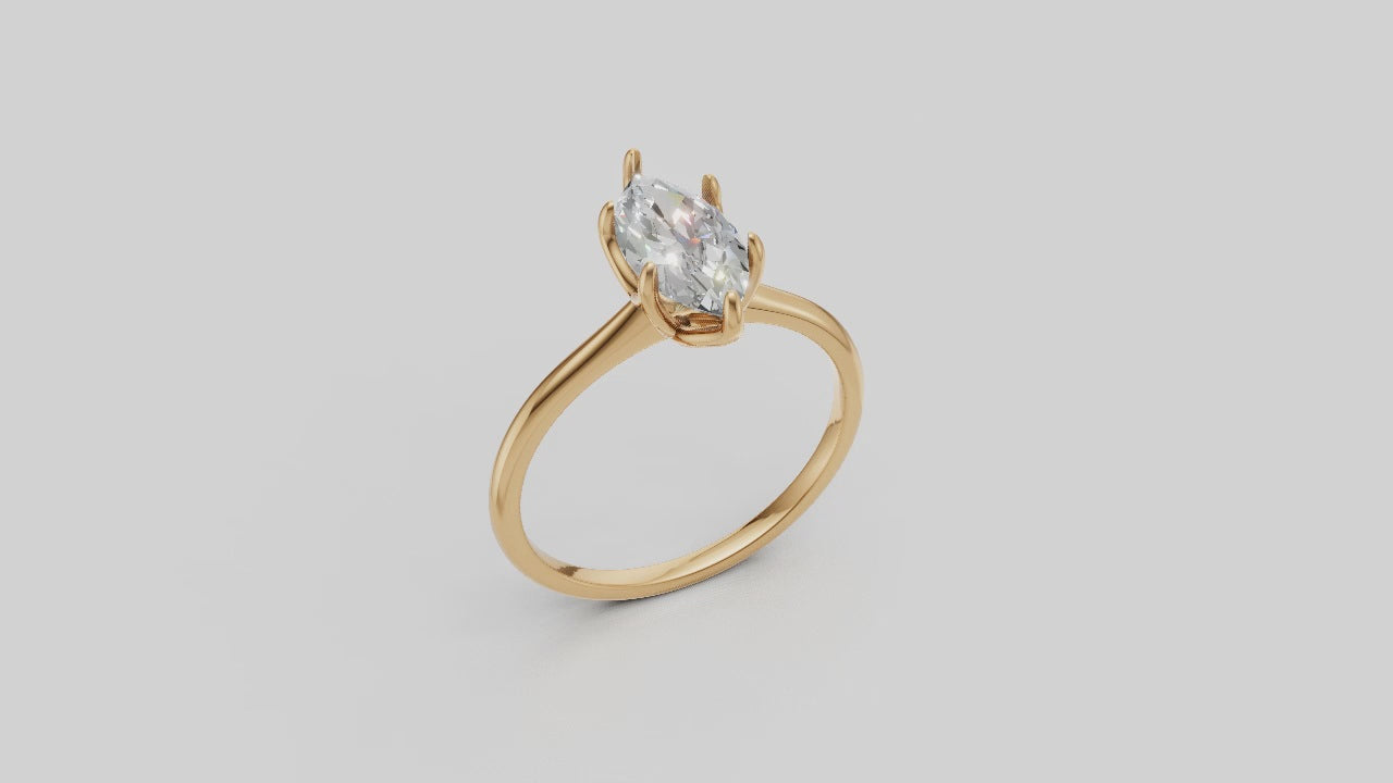 Simple, pero sofisticado, este anillo de compromiso resalta por su piedra central: un diamante de corte marquese con un brillo especial.