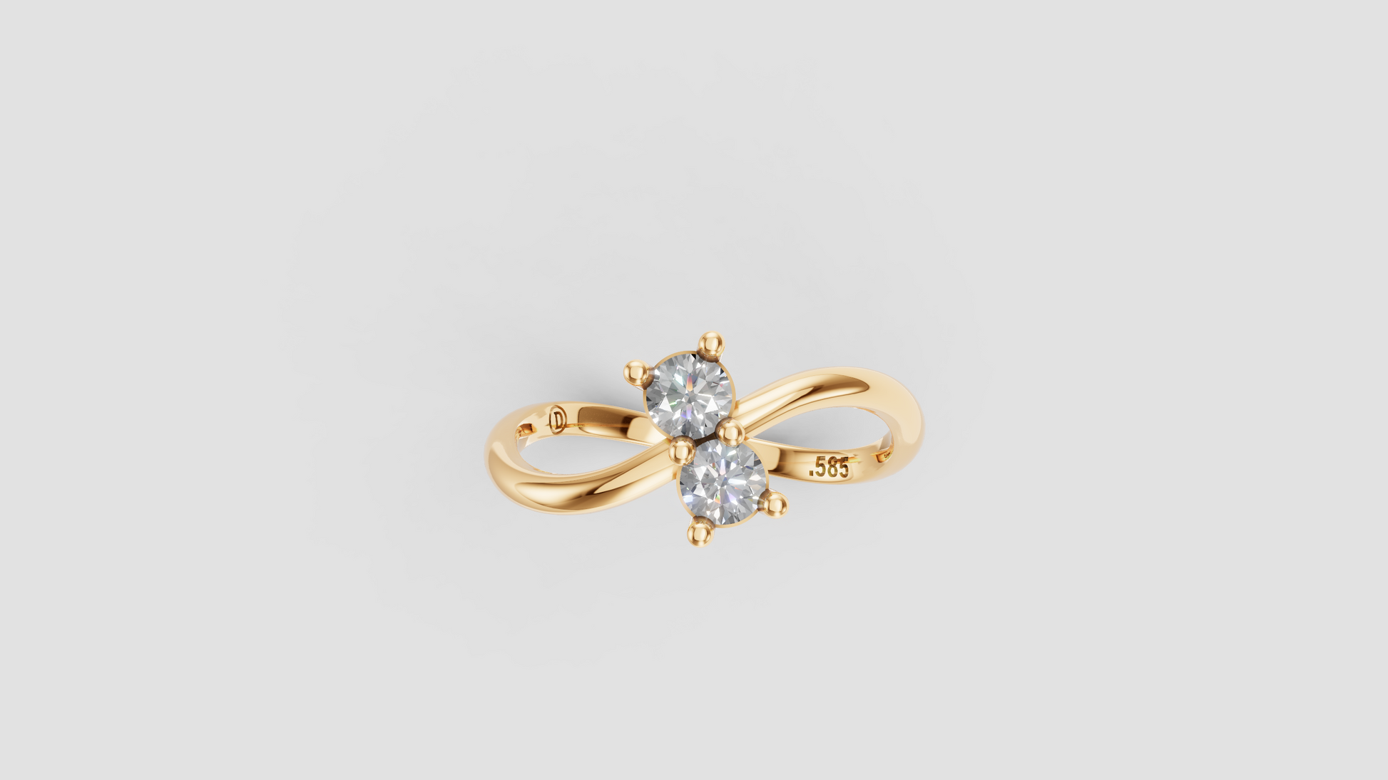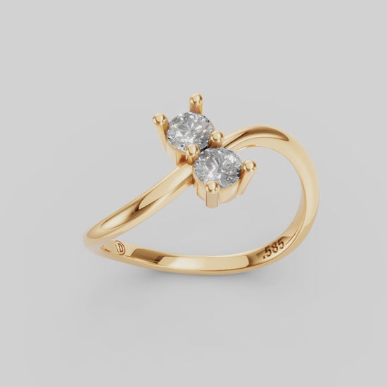 Un delicado anillo de oro que combina dos diamantes brillantes unidos por una banda torcida. Su diseño simboliza unión, equilibrio y eternidad,