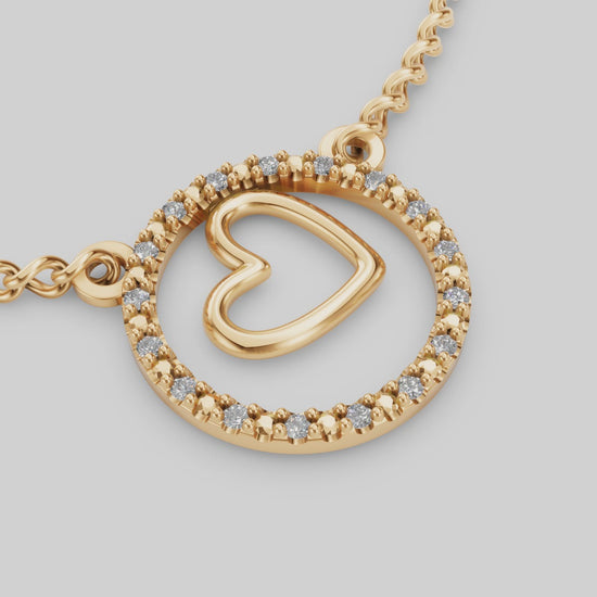 Un collar con colgante clásico modernizado. Presenta un pequeño corazón soldado a un círculo de brillante pavé. La armonía de estas figuras simboliza un amor indestructible.