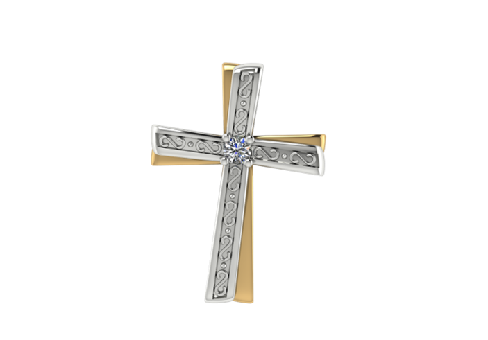 Este colgante de cruz con frente en tono plateado presenta delicados grabados ornamentales y un brillante detalle central, mientras que la base dorada aporta un contraste moderno y elegante.
