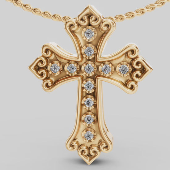 Reluciente cruz con pequeños corazones en las puntas y milagros al rededor de cada piedra. Este complejo diseño con aires vintage es una pieza que le agregara elegancia a su colección de joyas.